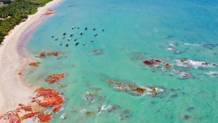 而在博鳌镇与潭门镇的交织处,红石滩则是琼海海岸的另一番惊艳。这里的礁石,是独树一帜的红褐色,波澜无时无刻地冲刷,在礁石上圈套前岁月的萍踪。潮流退去时,红褐色的礁石泄露水面,上头粉饰着一层翠绿的苔藓,红绿相映,在阳光的照射下,好意思得像一幅油画。沿着海岸线踱步,眼下是细软的沙滩,身旁是拍岸的浪花,海风拂过面颊,统统的热闹齐被吹散。