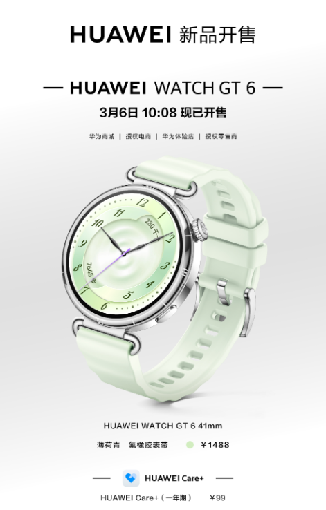 【CNMO科技音书】3月6日,华为结尾官方文告,华为Watch GT 6智妙腕表全新薄荷青配色认真开售,仅提供41mm版块,售价为1488元。据悉,华为Watch GT 6 41mm此前已提供流光紫、马鞍棕、魅影黑、浮光白、冰雪蓝等配色,46mm版块提供萧疏绿、冰川灰、雅丹黑等配色。