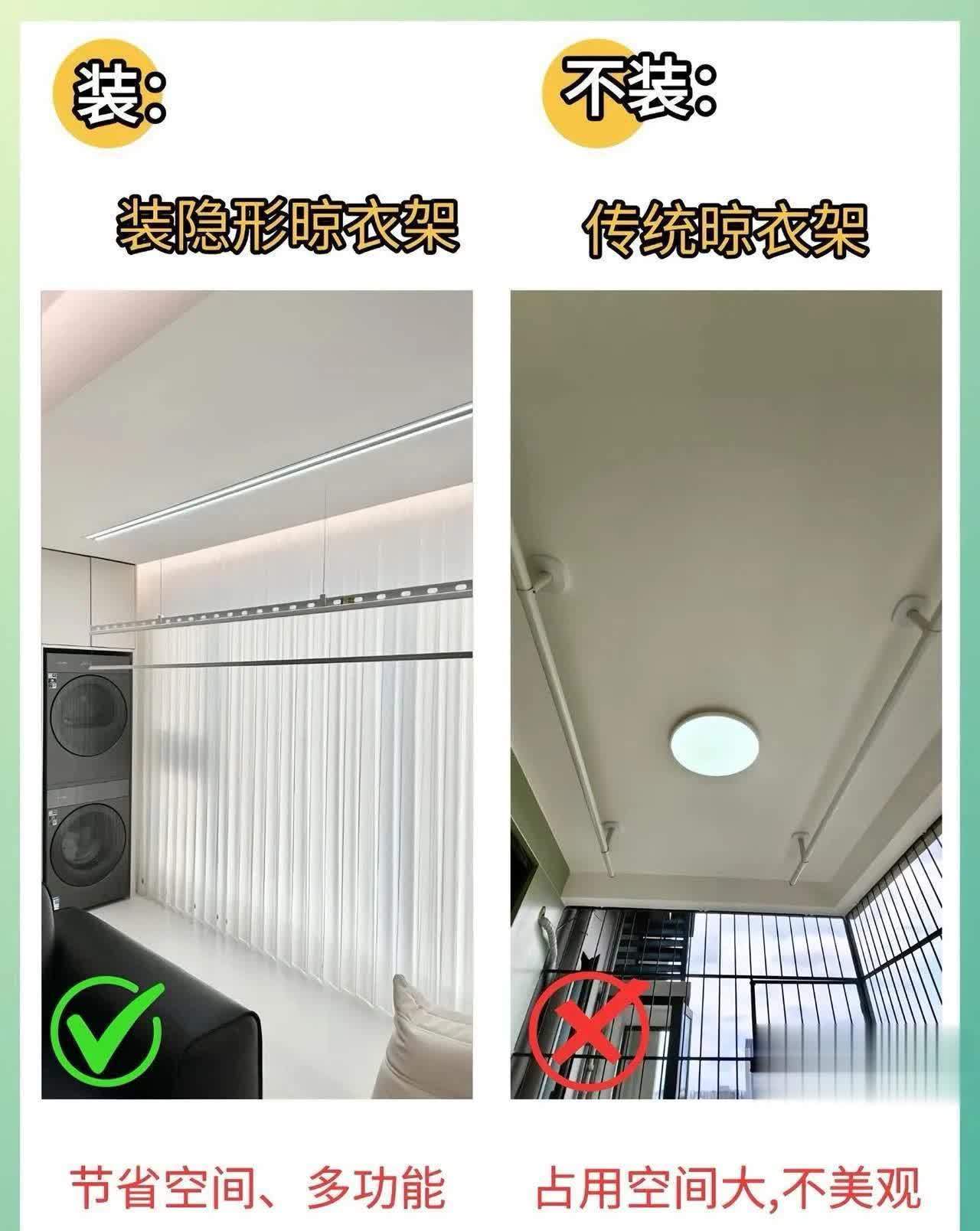 隐形晾衣架,可以王人备镶嵌吊顶内。无须时只好一条缝或一个盖板,险些看不见。用的时候按一下遥控降下来。有些还带烘干、照明、杀菌功能。