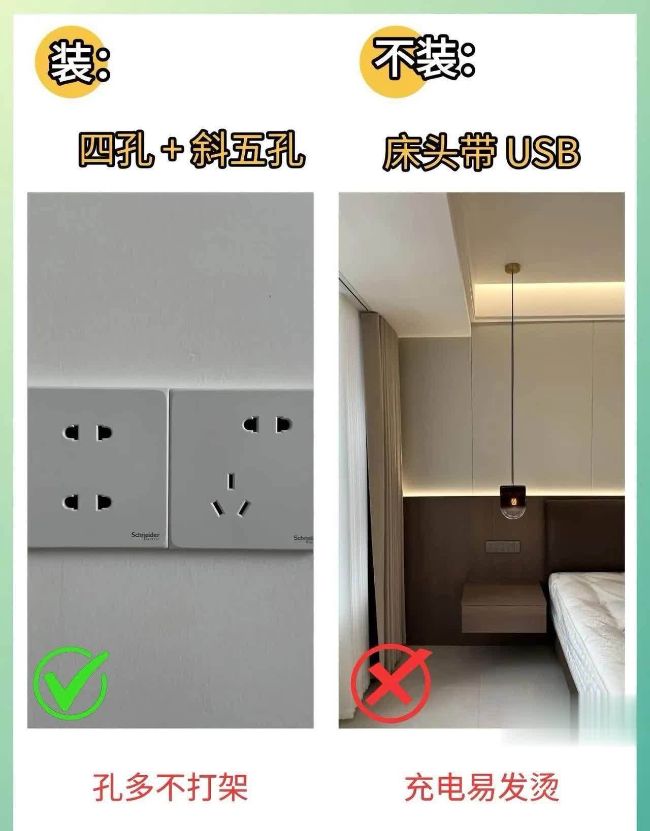 6️⃣ 插座布局:四孔+斜五孔 vs 床头USB