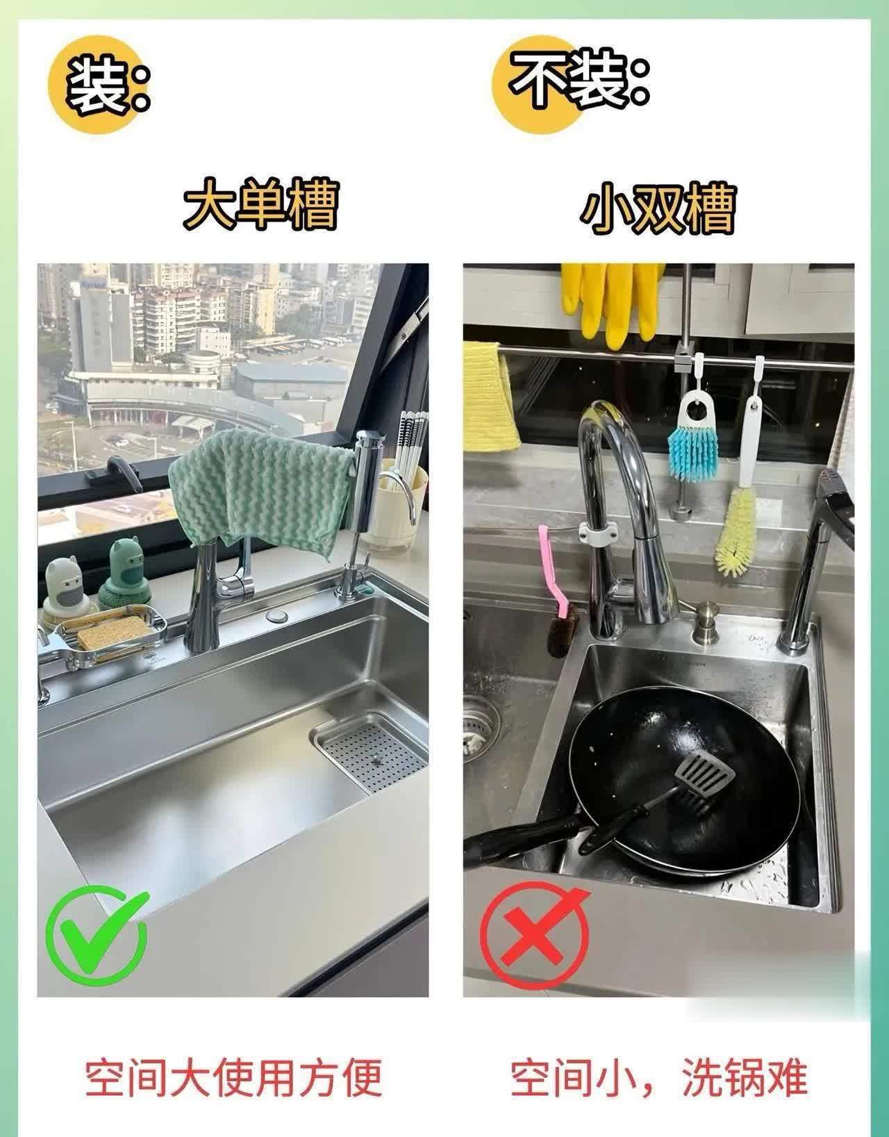 大单槽,长度≥70cm,深度≥20cm。所有这个词锅都能放进去平躺洗。搭配一个可出动的沥水篮或盆中盆,需要分区的时候就放上去,不需要就拿走,无邪性完胜双槽。